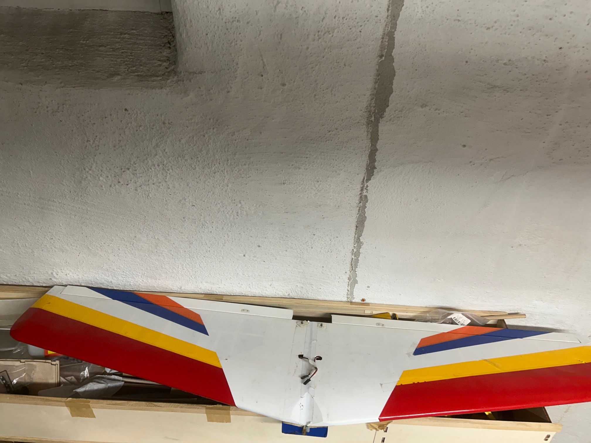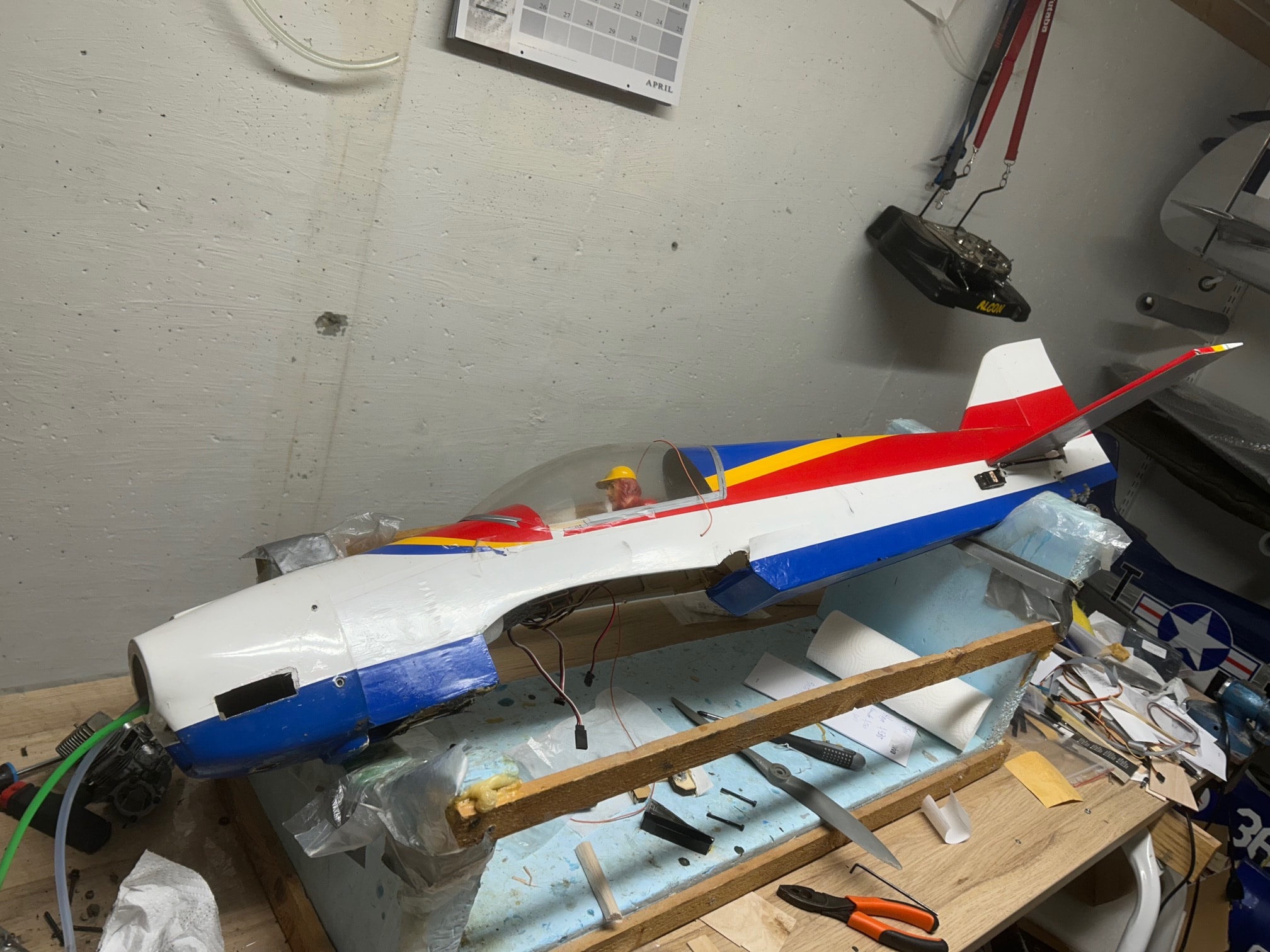 Laser F3a trainer med vingespenn 136 cm gis bort med servoer og mottakerbatteri. En skade på vingefeste i kroppen må fikses og understellfestet må limes på etter en landing i åkeren.